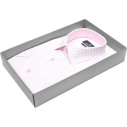 Розовая приталенная мужская рубашка Poggino 7001-06 в клетку с коротким рукавом